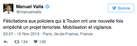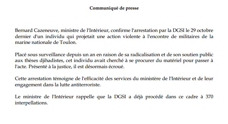 En cause : le fait qu’un couteau de combat et une cagoule dépassaient de l’un des colis. Aurait-il fini par être appréhendé quoiqu’il advienne ? Je l’espère. Sous surveillance, le suspect soutenait régulièrement sur Facebook des appels au djihad et conversait avec un contact, situé en Syrie et originaire de Roubaix, en vue de frapper des militaires de la marine nationale sur une base de Toulon. Plus qu’à espérer que ce type d’opération antiterroriste soit suffisamment rodé pour prévenir tout type d’attaque sur le sol français.
