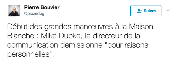 « Pour raisons personnelles ». C’est cela oui… Au passage, je fais de mon mieux pour couvrir tous les scandales de l’administration Trump mais pour être franc, il y en a beaucoup trop xD Dernier scandale en date —> La démission du directeur de la Communication de la Maison Blanche, Mike Dubke ! Seulement trois mois après sa nomination en février dernier u_u En cause —> Une volonté de Donald Trump à remanier son équipe due aux multiples polémiques qu’il doit essuyer depuis le début de sa présidence. À commencer par les soupçons de collusion avec des officiels russes lors de la campagne présidentielle. À ce jour, l’enquête du FBI est toujours en cours. Fervent supporter de Trump et l’une des figures de proue de sa communication, il semblerait que Mike Dubke ne supporte plus le climat ambiant.