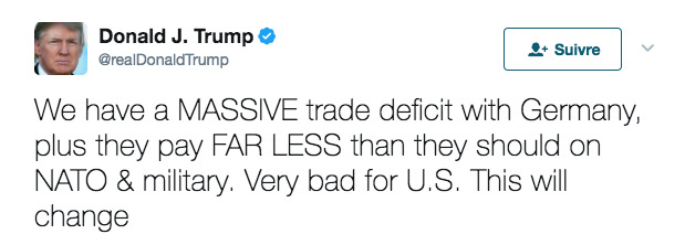 Sa lettre de démission a été acceptée par Trump qui ne devrait pas tarder à le remplacer. Notez que cette démission n’est pas la dernière et devrait être suivie de nouvelles défections d’ici peu. Mais assez parlé de Mike Dubke ! Depuis quelques heures, Donald fait 0 NOUVEAU parler de lui pour deux faits de comportements « indignes » ! Le premier —> Gigoter dans tous les sens avec un air niais pendant l’hymne du Memorial Day. Lequel rend hommage aux soldats US morts au cours de toutes les batailles menées par le pays. Deuxième comportement indigne —> Une énième saillie verbale à l’encontre de Angela Merkel, la chancelière allemande. « Nous avons un ÉNORME déficit commercial avec L’Allemagne ! Et en plus, ils contribuent BEAUCOUP MOINS que nous au budget de l’OTAN et le secteur militaire ! Très mauvais pour notre pays… Ça va changer !!! ». Un gosse de 10 ans.