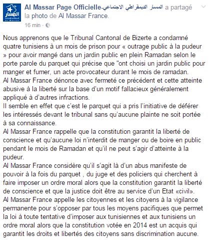 Seulement voilà, ce fameux article sanctionnant « L’Atteinte à la pudeur » est laissé à la libre appréciation des juges. Histoire de pouvoir punir celles et ceux qui oseraient ne pas faire le ramadan. Pour autant, cela n’empêche pas de plus en plus de jeunes de continuer à manger et à boire et cela qu’importe le moment de la journée. En guise de protestation, plusieurs Tunisiens ont même décidé de faire un pique-nique aujourd’hui ! En plein centre-ville de Tunis et devant le Parlement où ces 4 hommes ont été condamnés. Évidemment, j’applaudis cet effort de résistance qui est appelé à s’amplifier au fur et à mesure des années. Il serait temps que certains croyants comprennent que leur religion ne concerne qu’eux et seulement qu’eux. Ils n’ont pas à l’imposer à qui que ce soit. En espérant que ce cri du coeur puisse un jour aboutir à une véritable tolérance et liberté individuelle en Tunisie. Puis, un jour, dans le restant des pays arabes. D’ici deux ou trois générations minimum ahah.