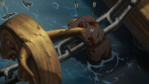Octobre 1013, Londres (Angleterre) : La capitale anglaise est assiégée par les armées du Roi Sweyn (Danemark). « Tu parles d’un pont ! » observe Askeladd alors que lui et ses comparses viennent d’arriver sur le champ de bataille. « C’est une véritable forteresse ». Pas étonnant que cette ville ait survécu à autant d’attaques aux cours des dernières années. Parvenir à s’y frayer un chemin sera d’autant plus difficile que Thorkell Le Géant, guerrier légendaire au sein des Jomsvikings, a décidé de se rallier à l’ennemi ! Sans qu’on ne sache vraiment pourquoi. « L’argent » affirme Bjorn. « Nous-aussi, on est là pour l’argent… » lui fait remarquer Askeladd. « Tout le monde veut avoir sa part du butin ». « Je ne combats pas pour l’argent… » déclare Bjorn. « Je combats pour tuer ». « Ahahah ! Et c’est bien pour ça que tu es mon lieutenant ! ». Sur ce, il est temps de capturer la rivière du Thame. Afin de créer une ligne de provision jusqu’aux camps intérieurs de Wessex. « Thorfinn ! Apporte moi la tête de Thorkell ! ». En échange, le jeune homme obtiendra un énième duel contre Askeladd. « Car c’est bien la seule chose que tu souhaites, n’est-ce pas ? ».