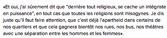 Elle a ajouté quelques instants plus tard que « Derrière tout religieux, il y a un jihadiste qui sommeille ». Yvette Roudy, ancienne maire de Lisiers (1989-2001), est notamment connue pour avoir été Ministre des Droits de la Femme de 1981 à 1986. Surtout, Yvette est une militante féministe de longue date et a toujours vu le port du voile comme un signe rétrograde et emblématique de la soumission de la femme au sein d’une religion patriarcale. À savoir dominée par les hommes.